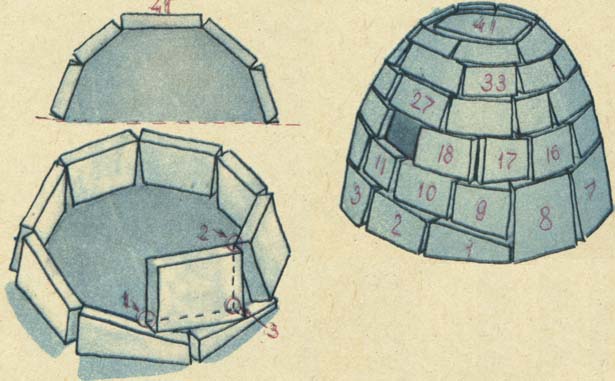 Первые блоки идут на закладку фундамента и имеют размеры примерно 100x50x30 см.Диаметр иглу очерчивают, исходя из расчета на одного человека не менее 2,4 м, на двоих - 2,7 м, на троих - 3 м. Первый ряд блоков подрезается по диагонали по всей длине до самой нижней кромки, тем самы образовыя начало спирали, после чего укладываютсяпоследующие ряды, причем первые ряды укладываются с внутренним уклоном в 25-30°, а последние в 40-45°. Таким образом блоки укладываются с постоянным наклоном и смыкаются верхней части, образуя купол. Купольное отверстие закрывается несколькими блоками уложенными на последний ряд.