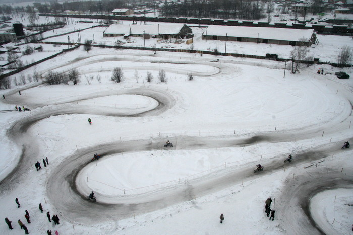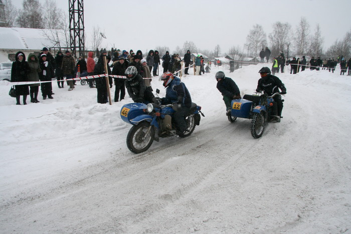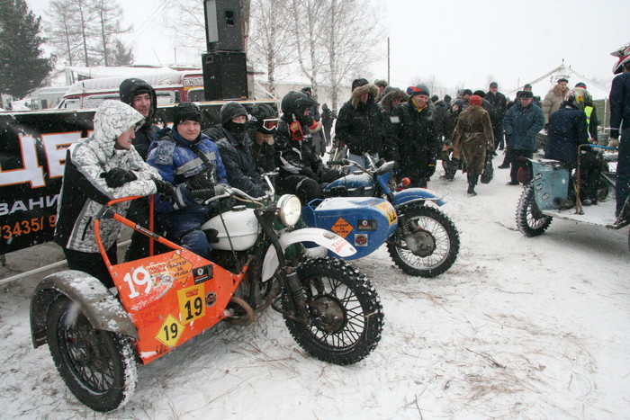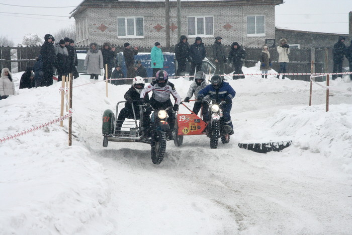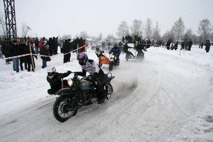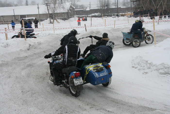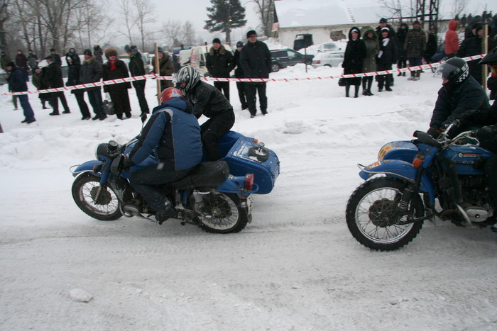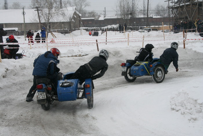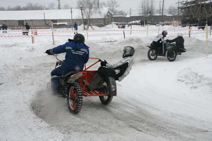 Гонялись по льду озера. На СноуДогсе соревнования проводились мотоциклов с коляской - синхронные кольцевые. 2 категории - Уралы и иномарки. На фото как раз наш экипаж запечетлен. По извилистой трассе и по льду, а не по снегу - нравится больше.