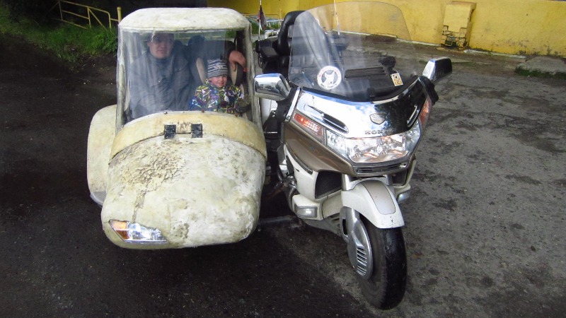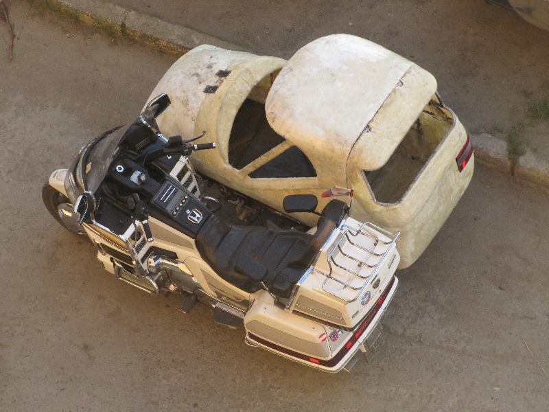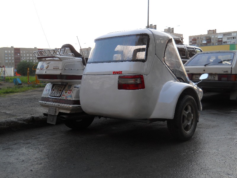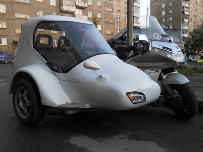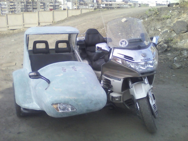 Всем привет! Прошлым летом я начал постройку коляски для своей Honda GL 1500se. Коляска стала необходимостью, так, как подрастает дочка, и хочется показать ей мир с мотоцикла. Сначала я хотел купить готовую коляску, но ценники на них не гуманные. И тут я подумал: а не построить ли ее себе самому? И вот прошлой весной я начал дело. Сначала соединил коляску с рамой, что надо признаться было не легко, информации о креплениях в сети мало, так, что пришлось додумывать все самому. После я построил несущий каркас вокруг сидений, затем обложив его пенопластом, вывел форму. После чего форму оклеил стеклотканью с эпоксидной смолой, затем удалил изнутри пенопласт. Получившееся корыто поставил на раму, и присоединил к мотику. Тормозную систему сделал от Лады восьмерки, от туда же и ступица и диск на колесе. Тестировал его всю осень, нагружал по всякому. Шесть раз ездил в Норвегию с ней, чем не мало удивлял местных жителей. Покатал еще немного весной, и разобрав начал шпаклевать и красить. Некоторые ценители могут заметить неровности на поверхности. Но я занимался шпаклевкой первый раз в жизни, и времени нету у меня все идеально натирать. Завтра двигаю в путь по России, съезжу к маме в Воронеж, а дальше, куда кривая заведет. Есть с коляской голда стала много. Точно пока не замерил, но порядка 10 л. на сотню. Управляется легко. Удалось мне добиться почти идеальной регулировки развала и схождения колес. Обошелся без демпфера. На маленькой скорости, и по кочкам, руль слегка подергивает, зато при разгоне, торможении, и просто по трассе идет ровно, как утюжок.