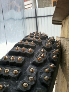 срезал протектор, потом из него заточным поршневым пальцем от мапеда в тисках выдавил все шипы всего около 300 штук обжег их в костре, потом отпескоструил в пластиковой бутылке с песком методом взбалтывания, и отдал на шиповку в контору мастер шпрот master-sport.ru/